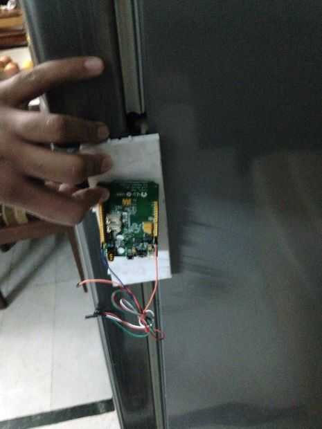 Ahora, finalice la instalación conectando el LinkitONE a la nevera. Hacerlo con alguna cinta adhesiva para conductos.