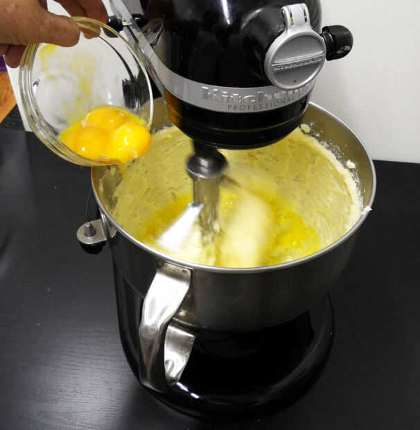 Añadir la mantequilla y el azúcar restante en otro tazón. Batir en una batidora de pie hasta pálido y esponjoso. Una vez que vea que la mantequilla se ha vuelto clara, reducir la velocidad a una velocidad de mezcla lenta (1 o 2 en un mezclador de pie) y agregue lentamente las yemas de huevo y el extracto de almendra.