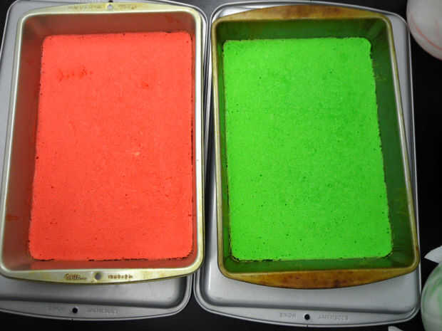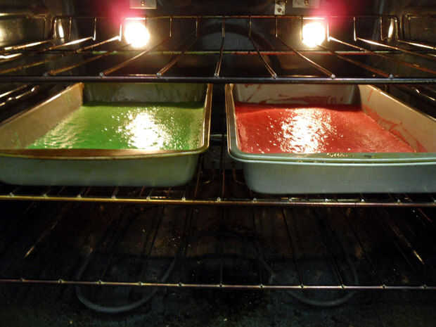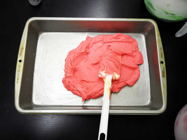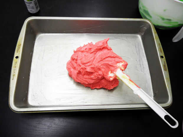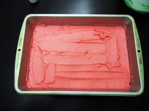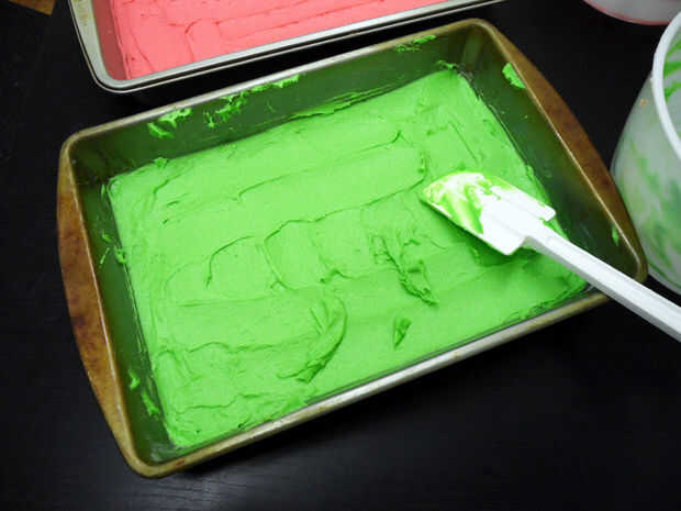 Engrasar 3 moldes de 13 x 9 pulgadas. Con una espátula, poco a poco difundir cada masa de color en la parte inferior de cada pan. Asegúrese de que la masa es todo. Incluso no mientras está horneando, si no ya nivelado. Una vez completado, introduzca sus primero dos bandejas para el horno. Cueza al horno las dos primeras sartenes durante