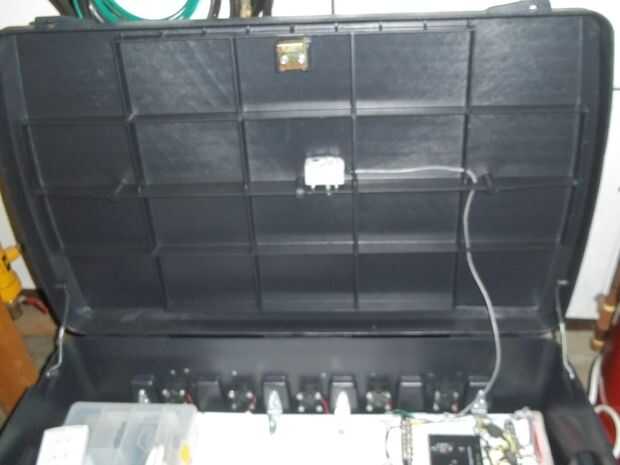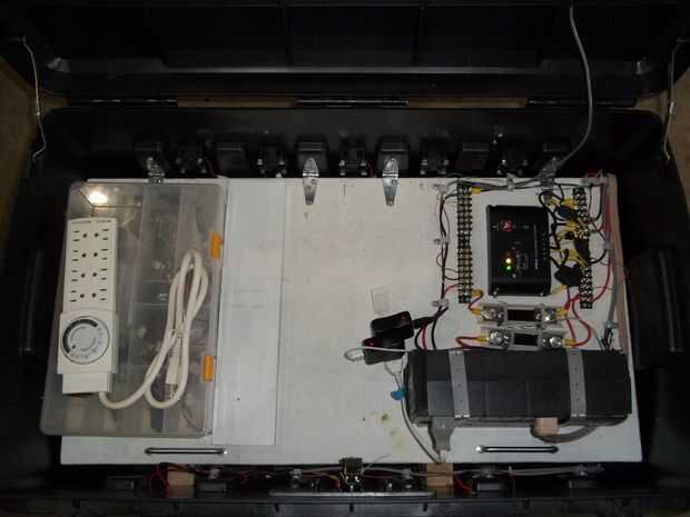 Esta es una vista de nivel superior.  Corte un pedazo de madera contrachapada de 1/4 pulgada para hacer un lugar para montar todo y pintados de blanco.  Entonces yo con bisagras en la parte posterior de la bolsa.   Ves a la derecha todos los controles. En el lado izquierdo es espacio vacío.  Por ahora tengo una caja de plástico con piezas adicionales y elementos a utilizar en la bolsa.  En la parte superior la caja de plástico es una regleta temporizador controlado, utilizo para controlar mi luces de Navidad.  También es un tablero blanco que uso para levantar la plataforma cuando necesito trabajar debajo de él.