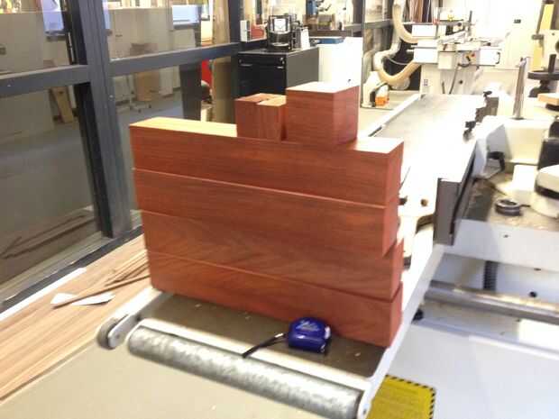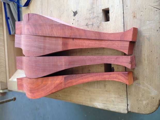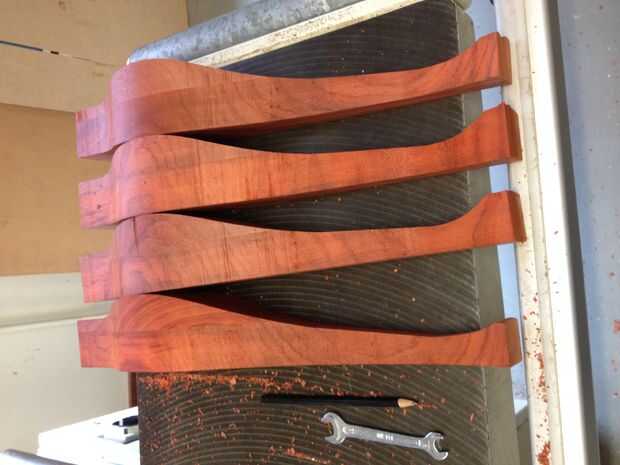 Compré el pedazo de madera para hacer las patas. Investigo como hacerlo a mano. Lo vi en la forma que yo quería y luego salió mal. No es fácil de trabajar... así que para ganar tiempo me tiré mis piezas y fui en busca de nuevos Padoek. Didn´t ir bien éter... Necesitaba 75mm por 75mm mínimo y nadie tenía. Envié un correo electrónico a Gelderland, Groninga, Limburg hasta Bélgica! No reaccionó o no teníamos todo... por el tiempo que hice 2 piezas. No tengo sobre ella entonces y no ahora! Pero tenía que terminarlo.