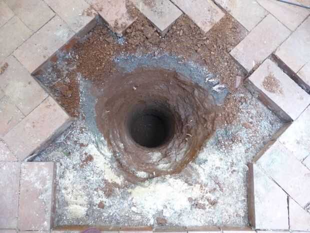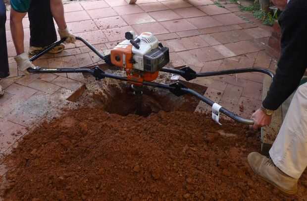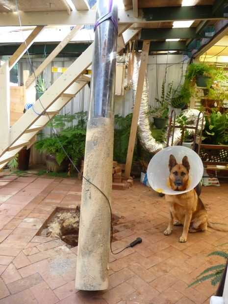 (Ellos) cavamos un agujero de 1,6 m (6') y concreta en la tubería, asegurándose de que era vertical y tenía las placas superior frente a sur verdadero, entonces bloqueado en su lugar con madera en la parte superior para que no mueva mientras seca el hormigón. Esto funcionó bastante bien, se produjo muy poco movimiento.