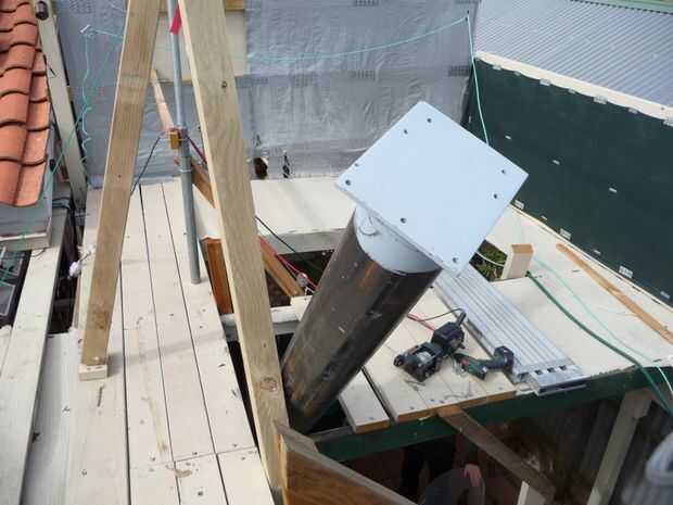 Habíamos instalado un desprendible 'grúa' hecha de una 4 × 4 winche reversible y pipa de agua para levantar mi montura y telescopio hasta la cubierta superior, y esto utilizamos la elevación de la tubería en posición vertical. Muchos ayudantes y un montón de sudor de mates y mi suegro hijos hizo los puestos de trabajo el trabajo.