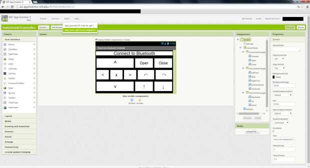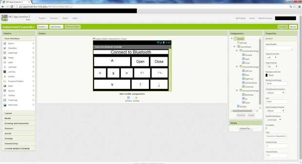 Como el Android app antes apoya el movimiento del tanque solamente, he modificado la aplicación y le añadió varios botones en MIT App Inventor. Para el marco de la aplicación consulte la foto. El concepto es muy simple: un botón y enviar una carta a Arduino a través de Bluetooth. Cuando Arduino recibe una carta, hará el trabajo que he asignado a esta carta. Además de cinco botones antes, seis botones más se agregan a la aplicación: abrir, cerrar, ↶, ↷, ↑ y ↓. Si recuerdas, sabes que he probado y había ajustado el rango de los 3 servos en la prueba de 1. Los botones "↑" y "↓" corresponden para arriba y abajo el movimiento del Servo 1. "↶" y "↷" movimiento hacia la izquierda y derecha de 2 servos. "Abrir" y "Cierre" garra de apertura y cierre garra de Servo 3.