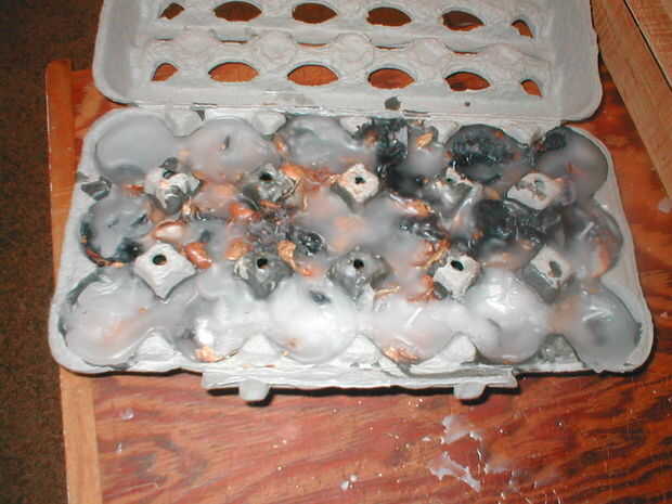 Use pinzas o una almohadilla caliente para eliminar la soda puede del agua hirviendo. Vierta la cera caliente sobre la pelusa del secador / cacahuete mezcla... Repita este paso hasta que se llena el cartón de huevo con cera. Poner congelador de int de cartón de huevo para 30-60 minutos para acelerar el proceso de enfriamiento.