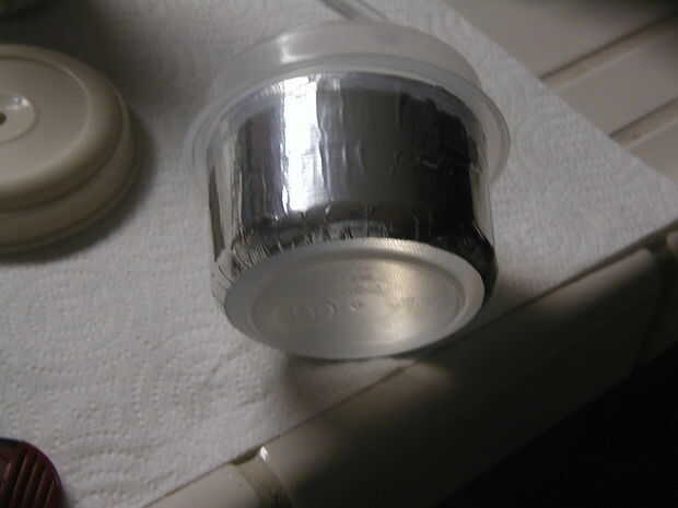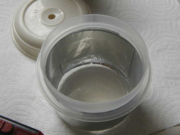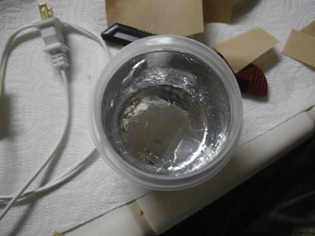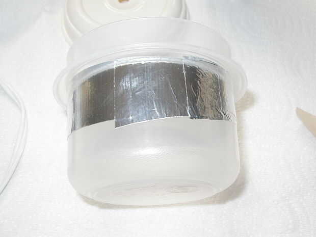 Paso uno: aplicar una capa de papel de aluminio para el exterior de la jarra, una 1/2" por 1" tira a la vez. Esto, con mucha paciencia y tratar de volver a, resultará en una capa lisa, que arruga-libre alrededor de la parte inferior exterior de la jarra. Trate de trozos más grandes si quieres, pero podría terminar arrugada debido a las curvas del contenedor.
