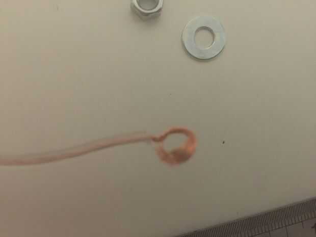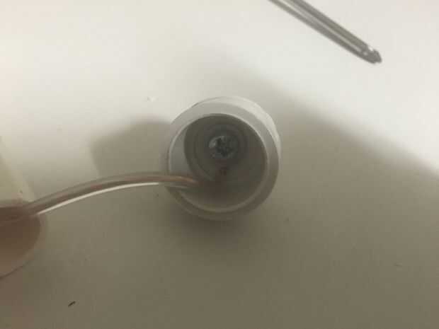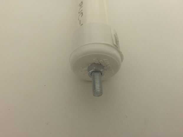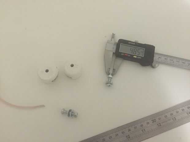 Medida de los pernos y perforó un agujero en cada tapa y pelado el cable, formado un bucle que se coloca sobre el perno y montados ambos tapones, tomé el perno de cabeza Phillips y coloca una arandela, el el lazo de alambre, luego otra arandela que alimenta a través de la tapa y sujetado en la parte exterior con una tuerca.
