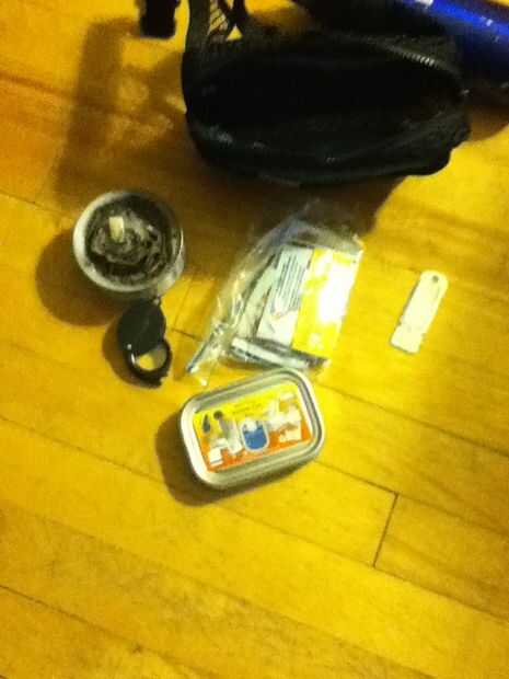La bolsa principal contiene documentos importantes. Los artículos son, una casera firestarter (cera, cartón y una lata) un kit de supervivencia de lata de sardina, un botiquín de primeros auxilios y el delantero para mi fuego de acero. Si yo pudiera tener una cosa de este pack de supervivencia, sin duda tomaría ese kit de supervivencia lata de sardina, ya que es un kit de supervivencia de bolsillo mini. Si quieres una, compruebe en su local de artículos deportivos tienda o google "Sardina lata kit de supervivencia.