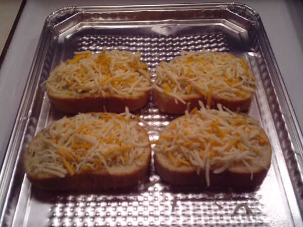 .Paso 1: ingredientes -1 barra de pan (yo usé francés)-Ajo mantequilla (yo usé 4 cucharadas de sazonador de ajo y mantequilla)-8 onzas de queso de ladrilloPaso 2: Derretir la mantequilla de ajo y cepillo en la parte superior del pan..Paso 3: Una vez