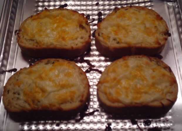 .Paso 1: ingredientes -1 barra de pan (yo usé francés)-Ajo mantequilla (yo usé 4 cucharadas de sazonador de ajo y mantequilla)-8 onzas de queso de ladrilloPaso 2: Derretir la mantequilla de ajo y cepillo en la parte superior del pan..Paso 3: Una vez