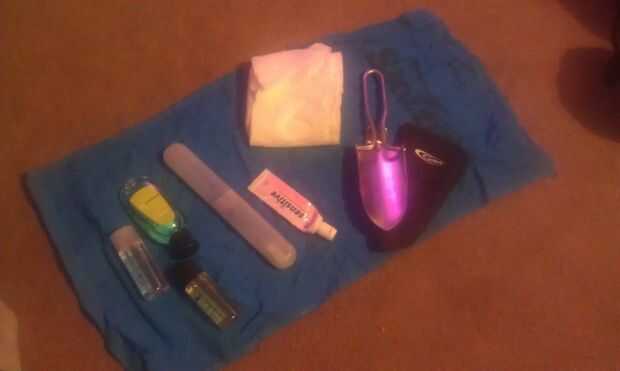 En el lado del bolsillo es donde guardo todas mis cosas de aseo, Esto incluye un cepillo de dientes, en un caso, una toalla pequeña, un Portarrollos aplastadas, una paleta pequeña, pasta de dientes, gell limpiador de mano, y algunos gell ducha y champú