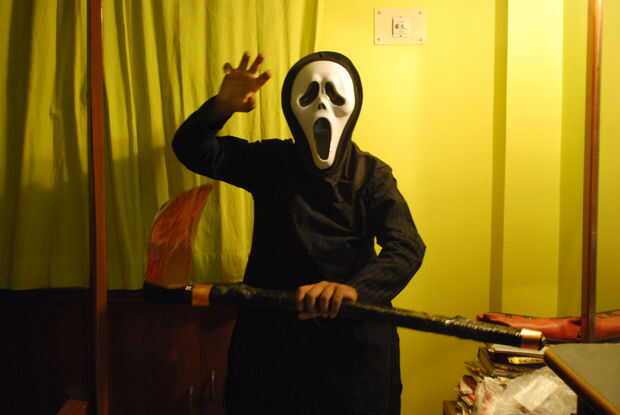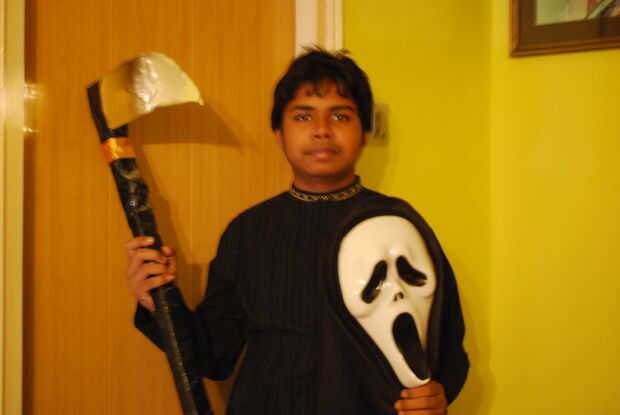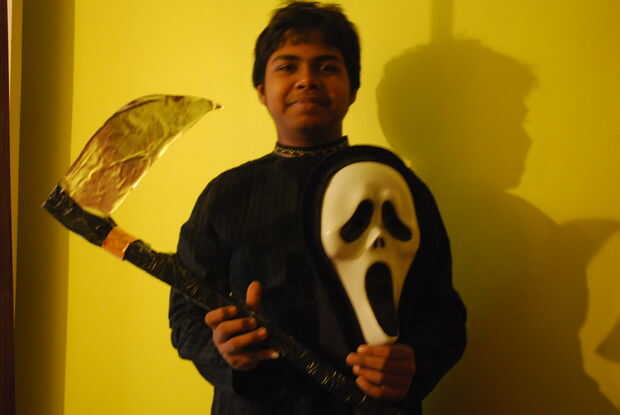 este año, he hecho 2 trajes... Un Samurai uno que usted puede consultar aquí. Tomó mucho tiempo hacer el samurai que me quedaba sólo 1 día hasta Halloween. Así. Trabajé toda la noche y preparó este traje. Hice este traje de parca usando uno de negro faldas envolventes de mamá, una camisa negra (llevaba la camiseta, poniendo la parte delantera a la parte de atrás) y he encontrado una máscara de scream en el armario. Hice la guadaña por mí mismo... usted puede encontrar el proceso de hacer la guadaña de aquí