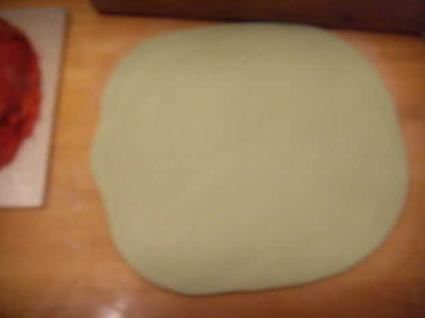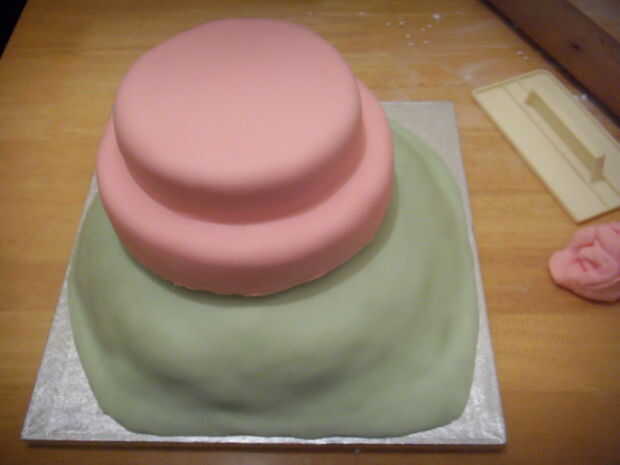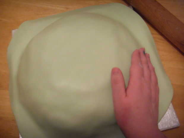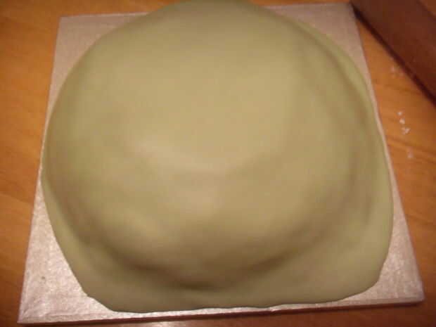 Extienda su verde (o elegido 'colina' de color), cubrir la torta a la Junta Directiva y liso en todas partes con una mano cónica (o suavizado de la herramienta que tiene uno). Aplanar cualquier exceso glaseado a la Junta Directiva y palillo por debajo con mermelada o con agua. Recorte cualquier pasta que va desde el borde del tablero de la torta.