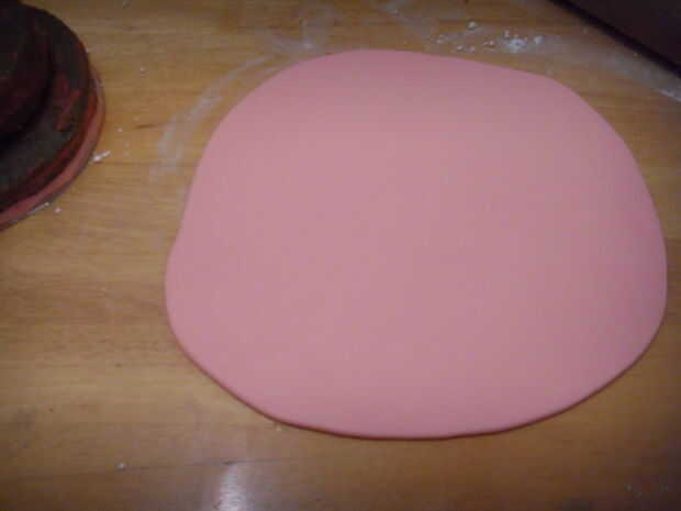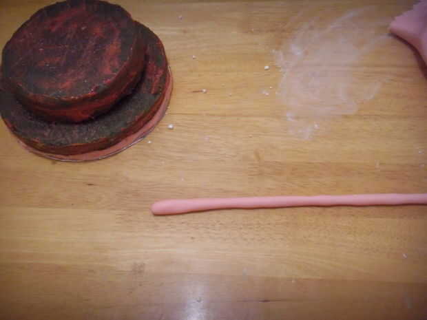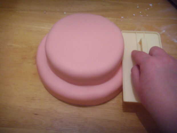 Si cubriendo palillo juntos su pastel a la Junta de la pequeña torta con mermelada, estirar la pasta de azúcar, transferir a la torta. Lisa la pasta en el nivel superior con la mano, luego suave la pasta hacia abajo en la parte inferior. Frótelo todo con una mano ahuecado o herramienta más suave, cortar el exceso, definir la línea entre los niveles con una herramienta suave o herramienta modelado con bordes recto.