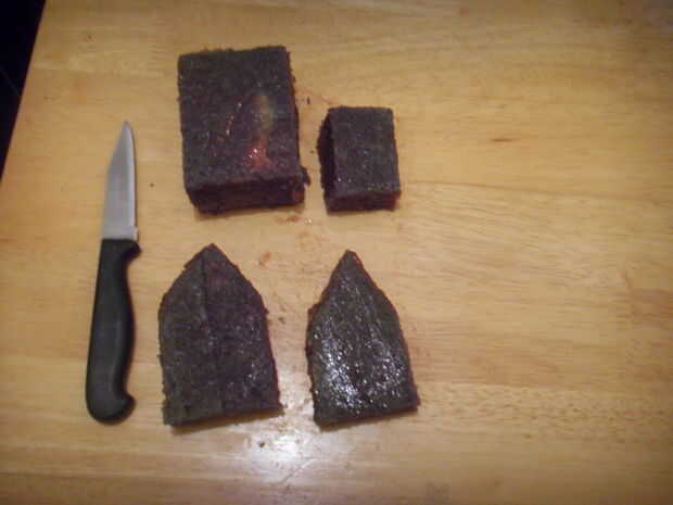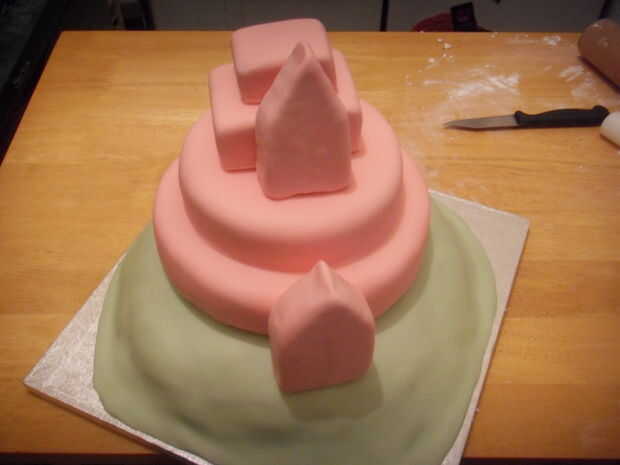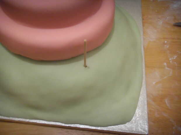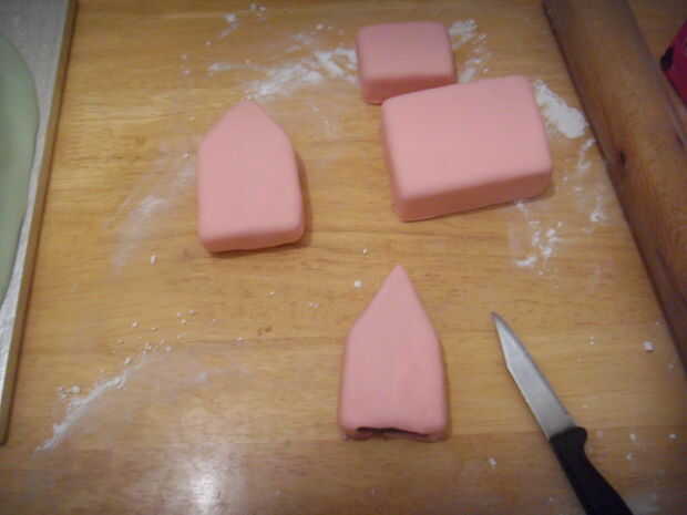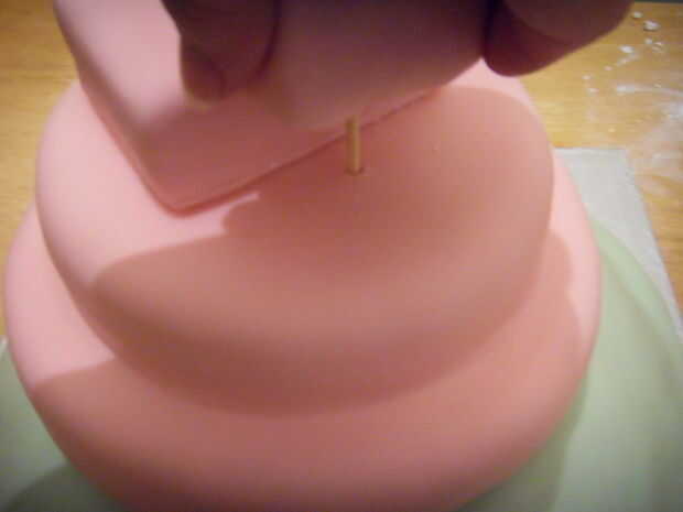 Mantenga un pincho de bambú contra el pastel para medir la profundidad. Corte el pincho a la longitud correcta (profundidad de la torta más profundidad del pedazo de pastel para rectángulos añadir un extra 1/2" para la pieza del techo para pegarse a). Inserte la broqueta en el pastel donde van las piezas, luego pinchar las piezas en su lugar.