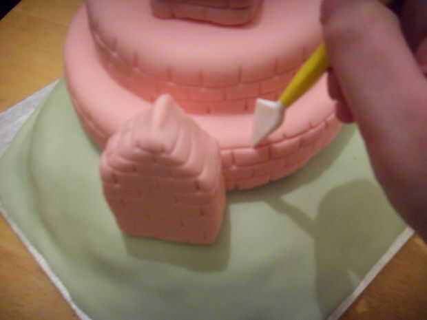 Marque las piezas de Castillo de pastel y todas las piezas pequeñas con líneas horizontales. Marca marcas verticales a intervalos regulares para trabajar un ladrillo patrón.