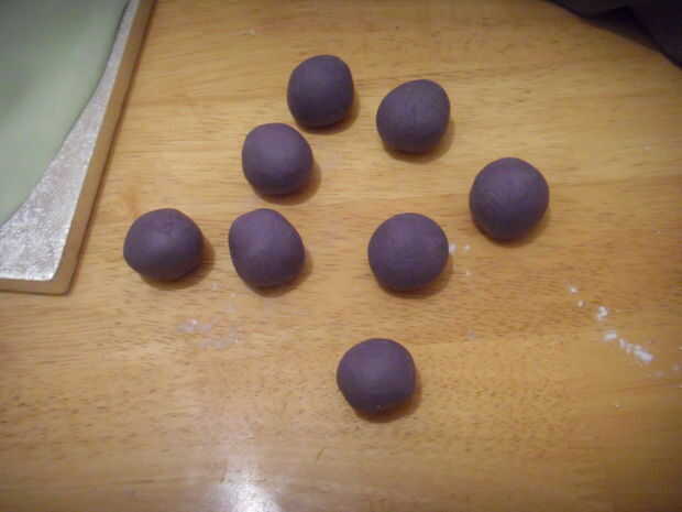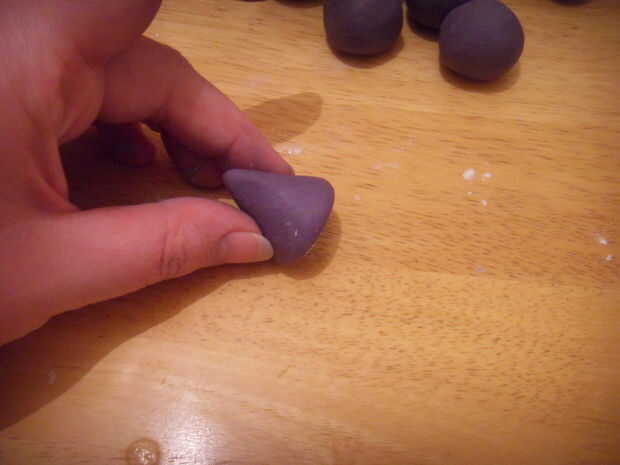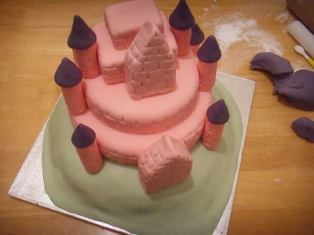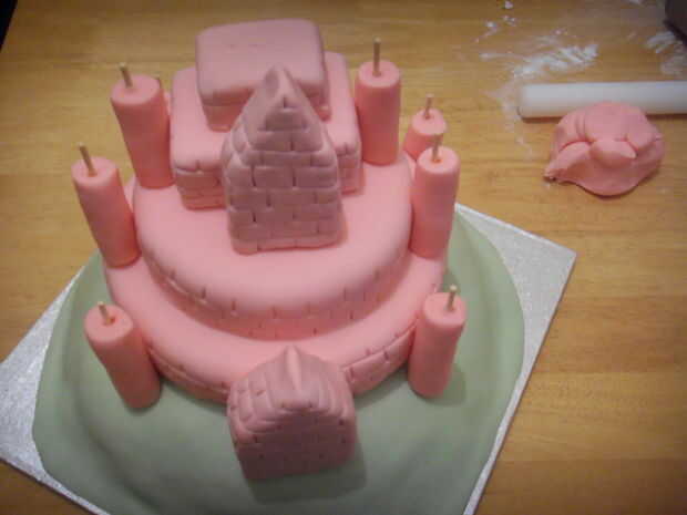 Estirar pequeñas bolas de pasta de azúcar en su color de techo/puerta (mina era de color púrpura). Hacerlas rodar en un ángulo con el talón de la mano para hacer un cono. Peguen sobre tus torretas. Marque todas sus torretas con líneas horizontales y verticales 'ladrillo' como el resto del castillo.