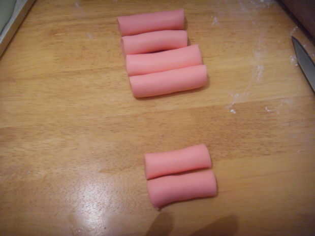 Estirar 'salchichas' gruesos de pasta de azúcar (he utilizado 8 torretas, pero usted puede hacer como muchos/pocos como usted tiene gusto pero cargas de torretas podrían reducir la estabilidad de su torta). Corte en secciones más de la profundidad de su torta. No todos tienen que ser del mismo tamaño, pero simétricamente opuesta los pedazos deben tener la misma altura (para este estilo de castillo, si no quieres un castillo simétrico, go wild!).