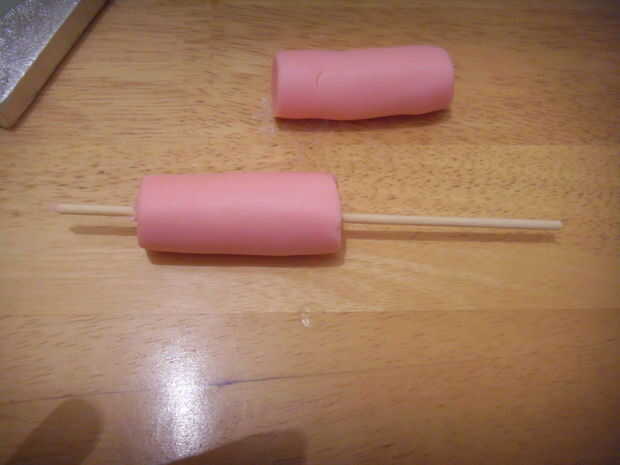 Inserte la broqueta a través de la torreta de pasta de azúcar, rodillo en la superficie de trabajo para suavizar, luego insertar en el pastel.