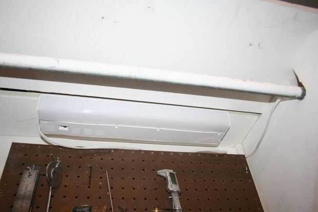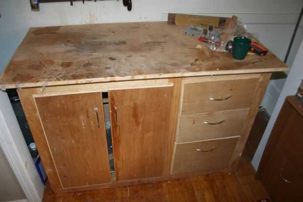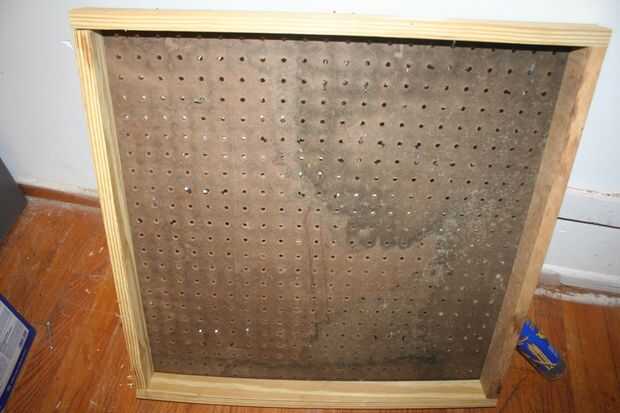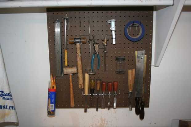 En mi dormitorio de repuesto que utilizo para un trastero limpió hacia fuera el armario y en un viejo gabinete de Artes mi esposa utilizada para acolchar que ella ya no usa. Agregué un estante ligero y una tira de la energía. Es una buena iluminación utilizo también clavija en focos. Con 1 x 4 y la pegboard hice un tablero de herramientas de 24 x 24"