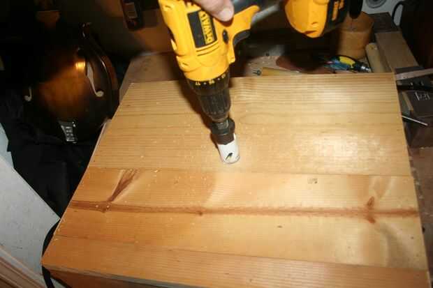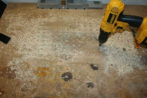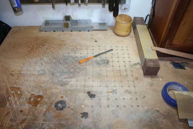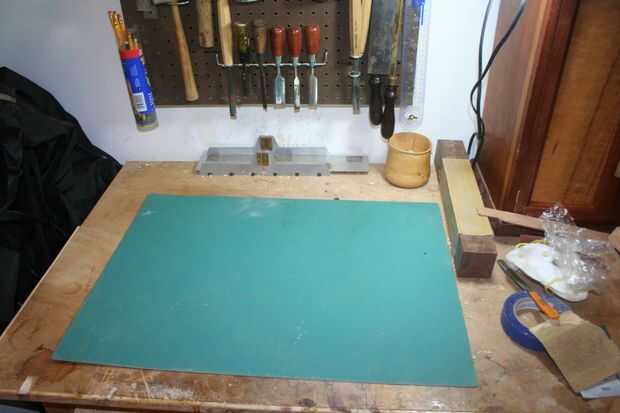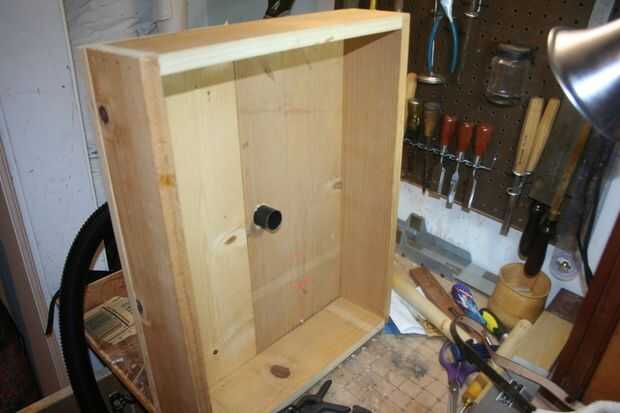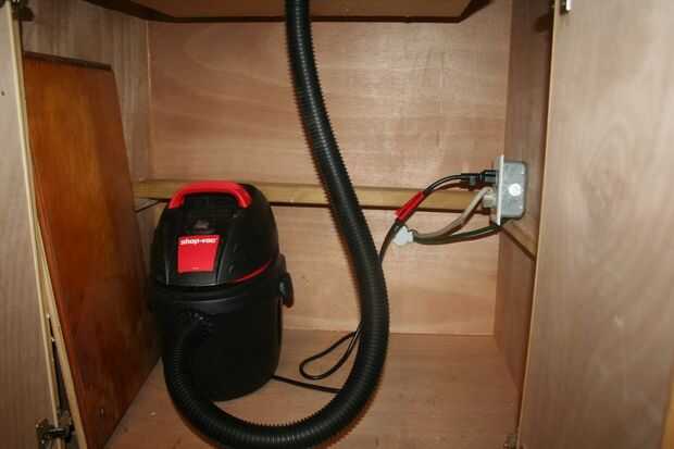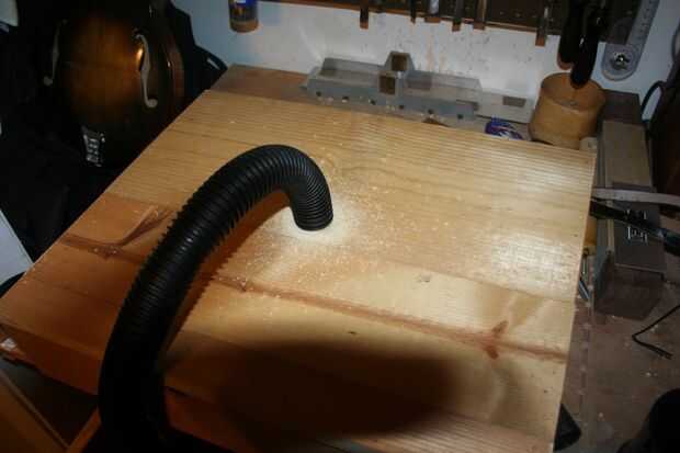 En la parte superior de mi armario sección I poner hacia fuera un 18 x 18" para el proyecto abajo y agujeros de perforado 3/8" 1 1/4" aparte para el polvo para ser tirado a través. Entonces utilicé 1 x 4 para hacer la caja de vacac con una 1 1/2""agujero que buje a la manguera de la aspiradora de taller. Dentro del gabinete puse en un recipiente para un pequeño shopvac y rompió la energía a él a través de un interruptor en el lado del gabinete. Cuando no está en uso, utilizo una estera de vinilo verde para cubrir los agujeros. Esta corriente descendente funciona muy bien.