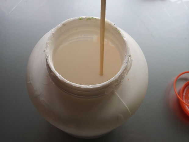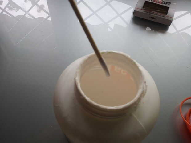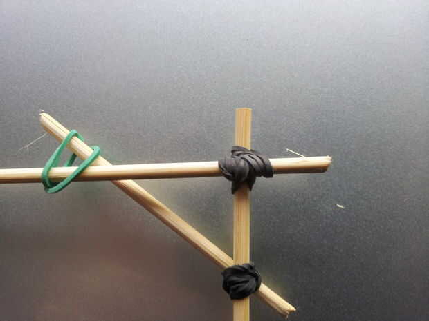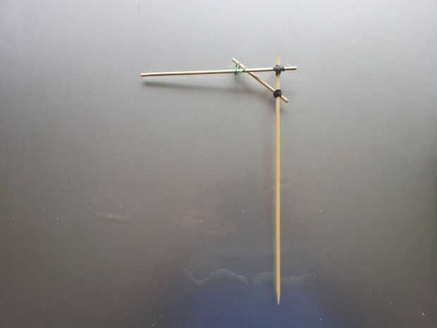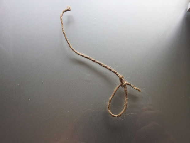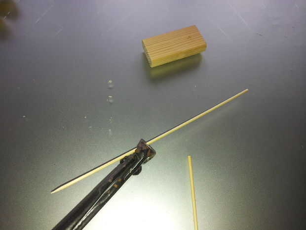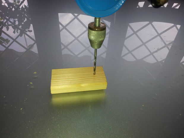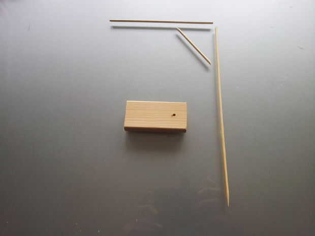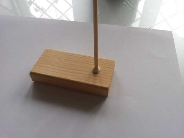 Taladro la pieza de madera para base, cortar los palitos de brochetas, palos con gomas de la aleación y añadir el pegamento antes de insertar la horca en el orificio de la base. Crea un bucle con la guita.