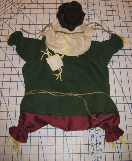 Para añadir algunos toques extra espantapájaros, cosí una mancha en la camisa y algún hilo que se disfraza como paja fue cosida en las aberturas para las piernas.