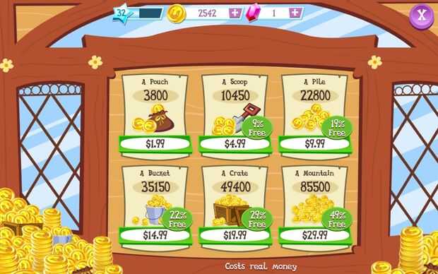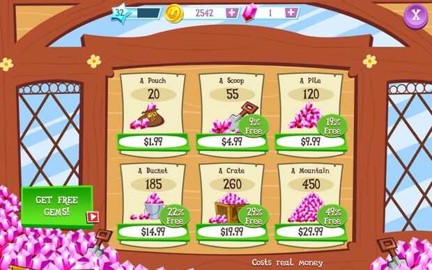 Usted puede notar que bits van desde 1909, $ a $ 2850. Mientras tanto, gemas son 10$ a 15$. Esto significa que la relación entre bits y gemas es 190 bits/joya en toda la gama. Ahora, si nos fijamos en la librería, usted notará que con tres ponis puedes saltar libros para 1 joya, usted obtener bits 385 y algún botín extra al azar a cambio. Es pedacitos/joya... 385 + loot.