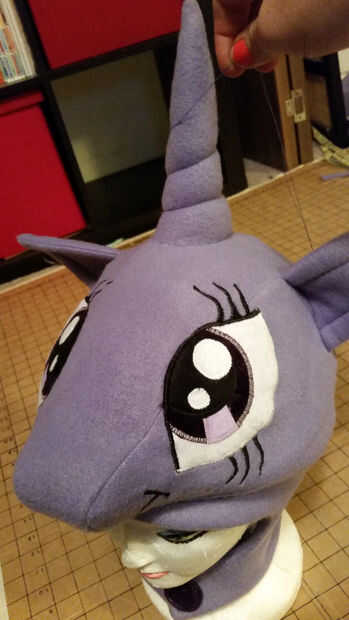 Encontré buenas posiciones para mis oídos y entonces cortar ranuras en mi casco, inserta las orejas, le dio vuelta adentro hacia fuera y coser las orejas en su lugar.