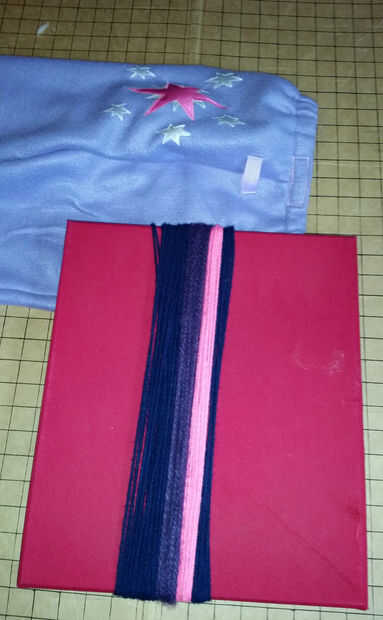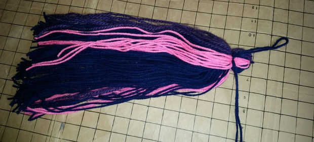 Me decidí a hacer la cola de hilo desmontable por lo que serían fáciles de lavar los pantalones. Envuelve el hilo alrededor de la tapa a una caja de almacenaje, atados los hilos en un extremo y cortar el hilo en el otro extremo, luego ató un cordón alrededor del hilo aproximadamente 2 pulgadas desde el extremo atado.