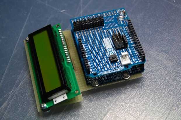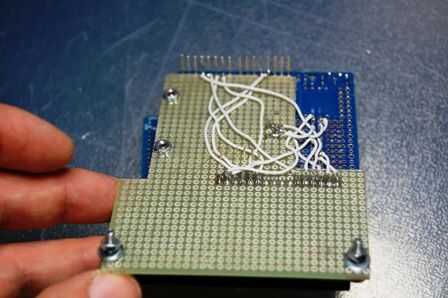 Así que lo que debemos hacer, vendimos (yo he soldado ligeramente inclinado, como se muestra en la figura 2, para mejor lectura de la pantalla) una mujer tira de 16 pies a la Junta Directiva de la matriz, hacer de cada pin que se utiliza (véase las tablas abajo) un cable soldado directamente al pin correspondiente de Protoshield, entonces vamos a superponerse a la placa Arduino y por encima de este escudo (última foto) conseguirá que se hizo para el servo y el sensor con cero cables visibles.