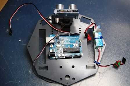 Hice un espacio para el servo de Ping, cuatro orificios para fijar el Arduino y puse la correa de fijación con un UBEC que ves a la izquierda y derecha de las dos fotos.