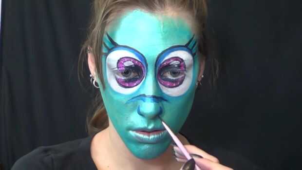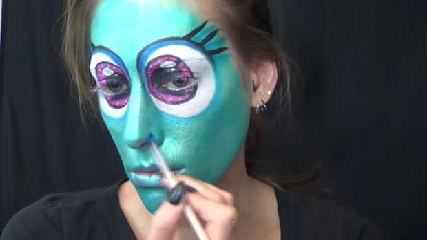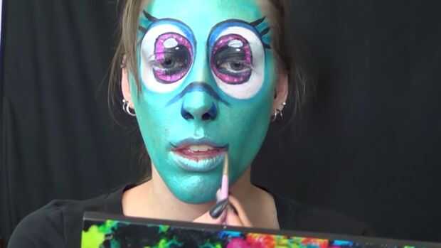 Con pintura de cuerpo blanco he añadido líneas en el color de rosa, luego con pintura negra y pintura azul oscurezca he añadido la nariz y la boca.