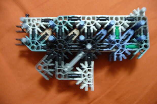Hola damas y caballeros, yo estoy aquí para presentar a mi K'nex totalmente poderosa pistola que dispara tan rápido que no puede siquiera Ve el proyectil deja el arma. Ideal para blancos de papel fuerte y gran precisión. La gama es de unos 15 metros