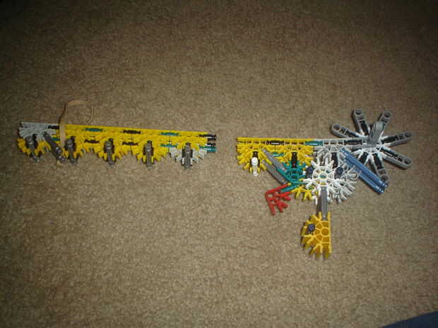 este es mi K'Nex pistola fueron tire hacia atrás el percutor luego upll el gatillo. Se basa en la pistola de Luger y una carabina M4. Si desea las instrucciones me avisan