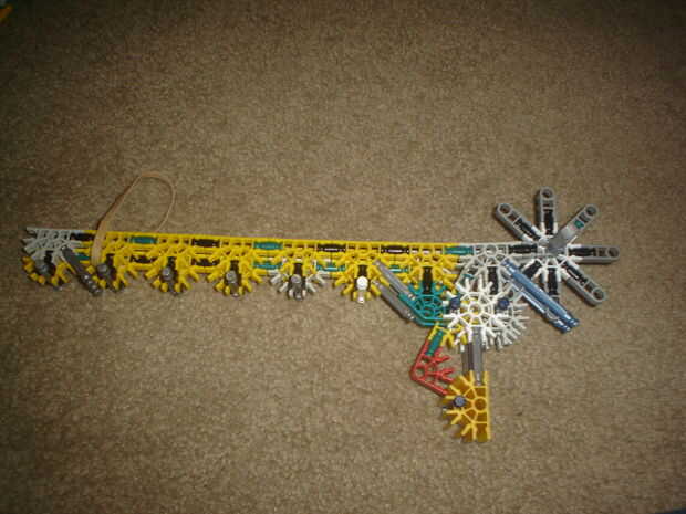 esta es mi arma favorita de K'nex construido por la propia. es una foto única pero puede ser muy potente dependiendo de cuántas gomas le agregue es el mecanismo de disparo. Me gusta porque hace buen uso de piezas de flex. Trabajar la pistola tirando