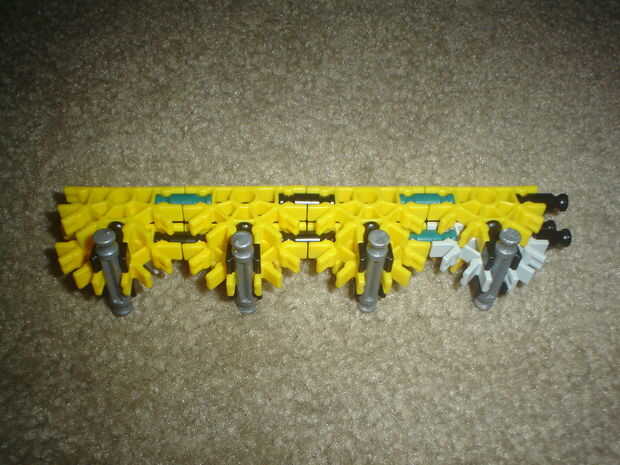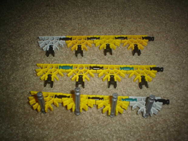 esta pequeña pistola K'nex es muy simple y utiliza solo 12 piezas (no incluye munición o una vista). No utiliza una banda elástica o bien.Paso 1: partes Arma:4 barras azul2 barras amarillas1 barra blanco2 conectores verdes1 conector amarillo3 conecto