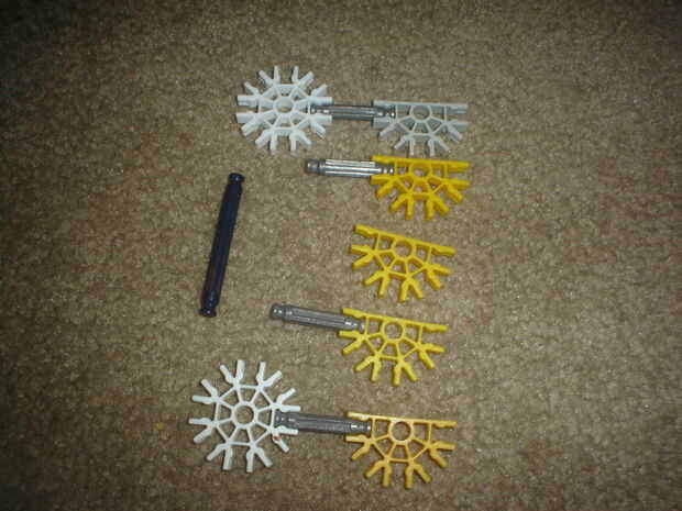 esta pequeña pistola K'nex es muy simple y utiliza solo 12 piezas (no incluye munición o una vista). No utiliza una banda elástica o bien.Paso 1: partes Arma:4 barras azul2 barras amarillas1 barra blanco2 conectores verdes1 conector amarillo3 conecto