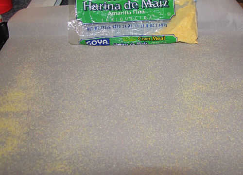 Mientras sube la masa, preparar o bandeja de hornear/pizza cubierta con pergamino (o engrasar bien) y luego rociar ligeramente con harina de maíz fina (opcional). (No hemos nunca probamos esta masa en una piedra de pizza, puede un día y animar a otros a hacer lo mismo.)