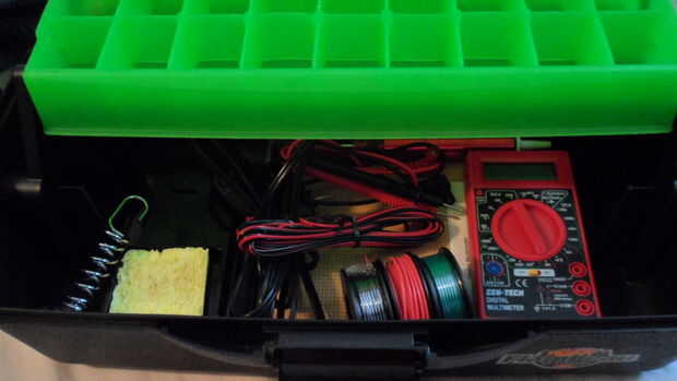 puse mi tabla perf en la parte inferior, así como mi soldador, desoldar pistola, soldadura, probador de continuidad, manuales, cables extras, peladores de alambre (y eventualmente, mi 2.000 + resistencias en bolsas)
