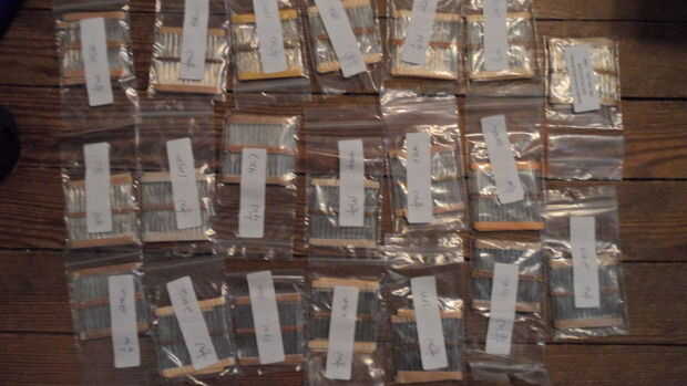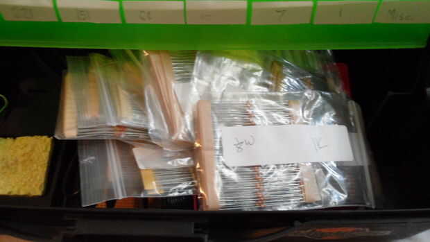 como ya he dicho, tengo 2.000 resistencias que tengo para 10$ dólares fuera de eBay :) Afortunadamente ya estaban ordenados en bolsas y etiquetados. UFFF. no podía caberles en una sección, así que los pongo en la parte inferior.