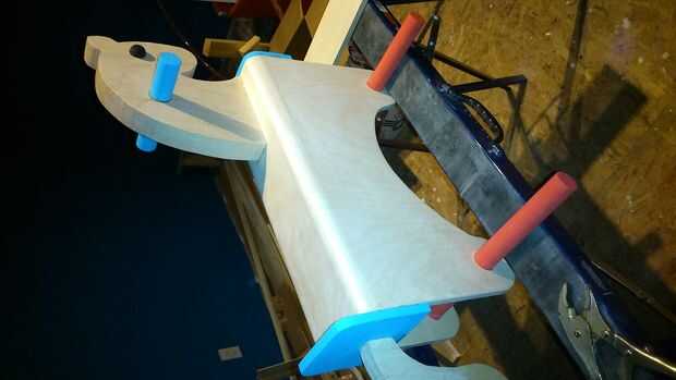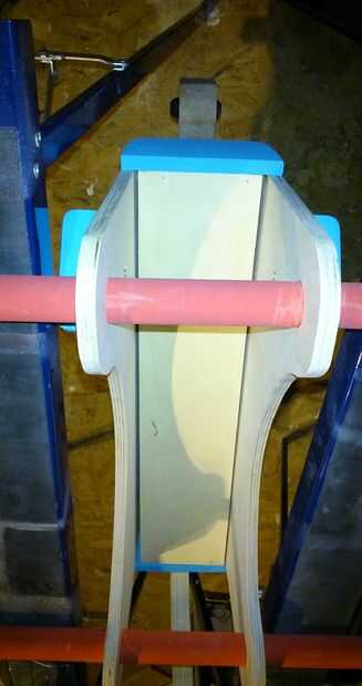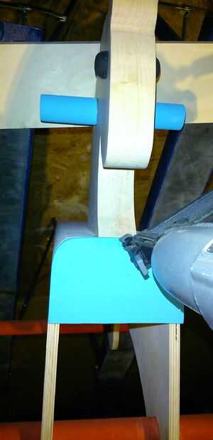 6. Verás puntos azules en la parte superior del eje de balancín. Estos son los agujeros que perforaron a través del eje de balancín en a la espiga y poner 4 tornillos para madera para que los tacos no te miss alineados. Te recomiendo hacerlo desde la parte inferior de la mecedora como entonces no mostrar los puntos.