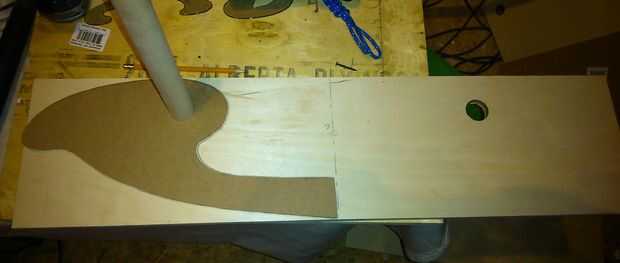 - Encontrar la línea de centro (16 pulgadas) en la madera contrachapada. Tomar una pieza y usar el MDF para dibujar las imágenes de espejo usando la línea de centro. Dibujar la plantilla de la mecedora más plana posible y la mejor imagen del espejo que se puede obtener. La primera pieza de madera contrachapada se utilizará como plantilla para construir más de 3. ¡ Ya no necesita la plantilla MDF. Utilizar cualquier técnica para copiar la madera contrachapada. Fracasé miserablemente en esto como en mal estado en la Sierra de cinta al intentar hacer una curva agradable en la parte inferior de la mecedora. Me di cuenta que realmente no podía tener una curva agradable con este tipo de plantilla a menos que yo utilizar un router.