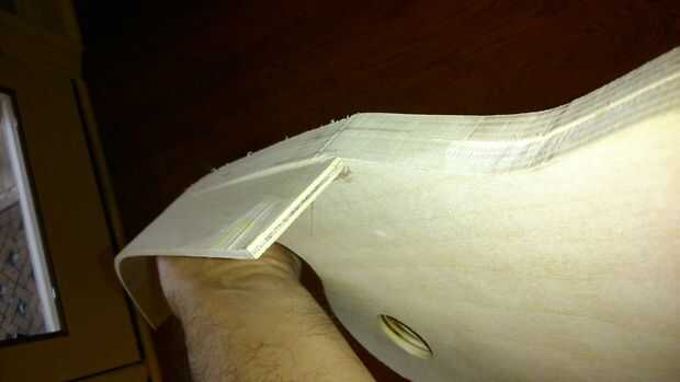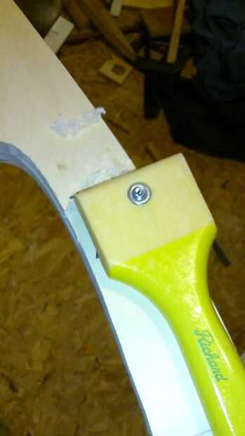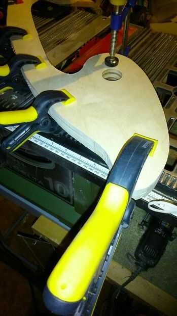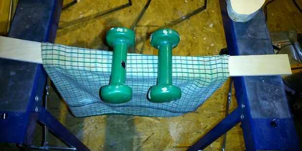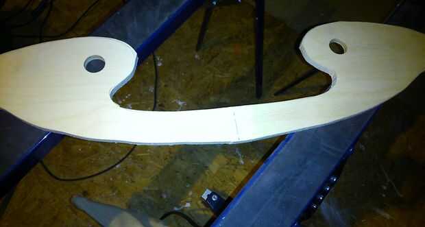 - Prueba 2 - utilicé una curva rugosa, a mano alzada alrededor de la base de la mecedora. Entonces yo doblar una tira de 2" de madera contrachapada de 3 capas mojando lo y luego poner un par de mancuernas en el centro mientras descansan los extremos en el caballete. Lo deje reposar toda la noche. En la mañana tuve una pieza curvada muy bien para ser utilizado como una plantilla en mi sierra.