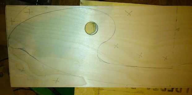 - He marcado y perfore orificios piloto de 1 1/4" tacos que serán perforados para los tacos de eje de balancín más adelante. Corte la plantilla de mdf con un desplazamiento o una sierra de cinta o lo que usted está cómodo con.