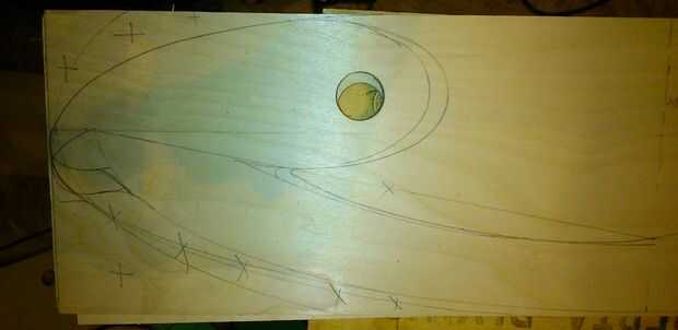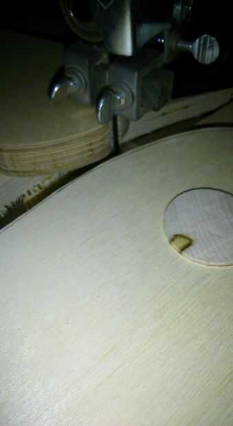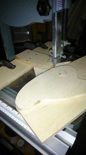 - TIP: Para hacer todas las piezas del eje de 4 balancín a ser el mismo y ajustar bien al cuerpo, use los agujeros del eje de balancín como guía. Ver fotos. Perfore los dos agujeros piloto con una 1/4 broca para los orificios para taquetes de la primera pieza de madera contrachapada. Se utiliza para alinear las 3 piezas y taladre el orificio piloto para todas las 4 piezas. Esto asegurará que los agujeros del pasador por el agujero veía se alinean correctamente. Perfore los orificios para taquetes en cada una de las piezas con la sierra. Corte la forma en la Sierra de cinta. Para cortar el segundo, tercer y cuarto utilicé mi plantilla plantillas de Sierra de cinta hecha en casa para los cortes. Es sencillo y puede construir en ningún momento. Por supuesto, si tienes un router y un poco de las plantillas use. Será más fácil, limpiador y menos tiempo de lijado. Cada pc de eje de balancín de corte individual fue un error. Yo sugeriría que después de taladrar los orificios para taquetes, primero laminado 2 piezas de 1/2 capas juntas y luego utilizar la sierra. Esto le ahorrará un montón de lijado innecesarios