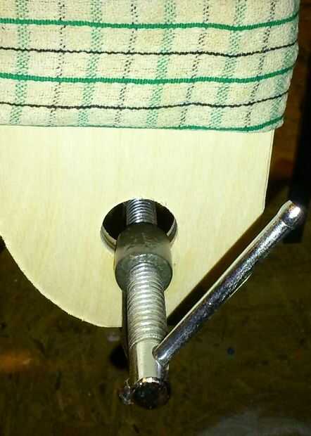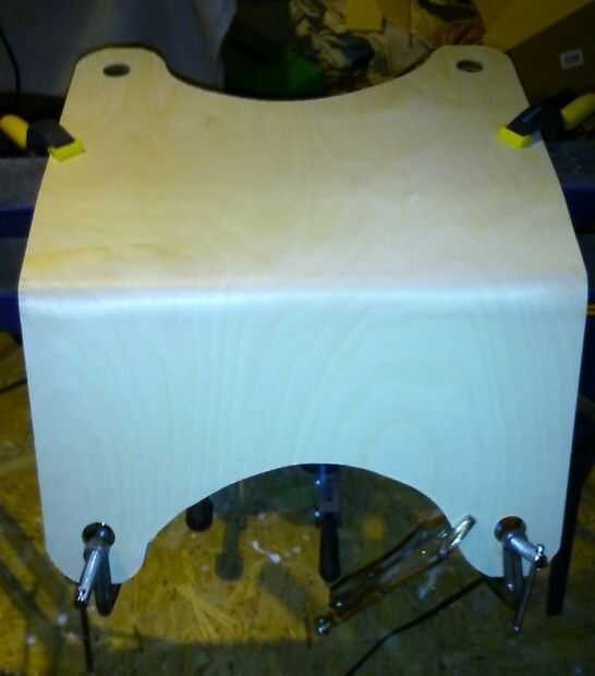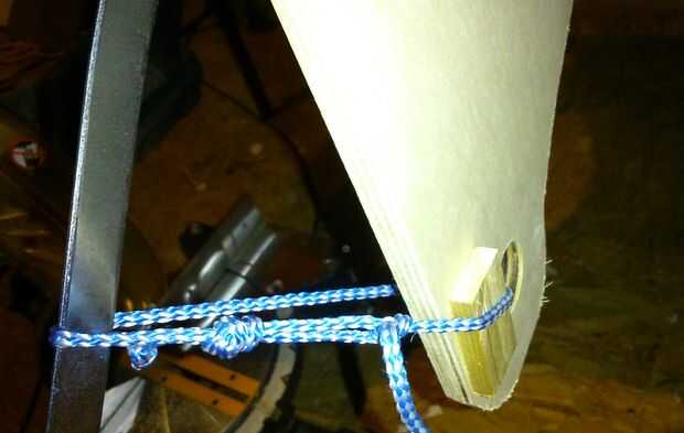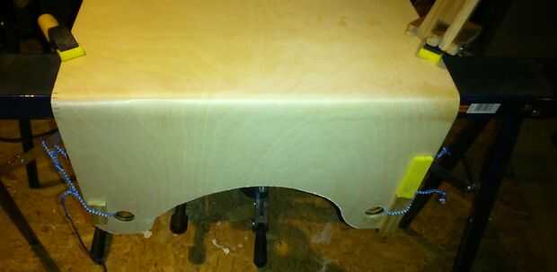 7. Usé la gravedad como mi amigo y colgó algunas abrazaderas en los orificios para taquetes. Yo seguí planchado y en 10 minutos tenía la madera curva a casi 60 grados.
