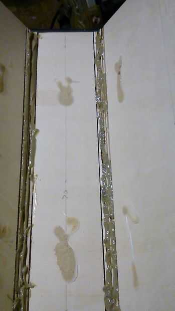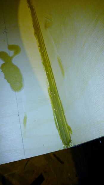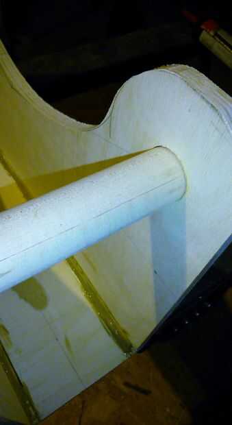 14. Deshacer los tacos y desplegar el cuerpo lo suficiente como para poner algun pegamento de PL en las cortes. Unbent el cuerpo a 45 grados que fue suficiente para poder poner el pegamento. Doblar el cuerpo a su forma. Al estar inclinado hacia atrás, el pegamento puede exprimir pero sólo pueden ejecutar una pieza de madera de desecho y que se vea decente. No te preocupes demasiado que esto Haz cubierto por una pieza de contrachapado durante el montaje.
