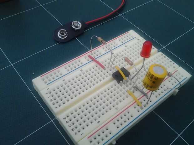 Un circuito muy simple que se puede construir a blink o flash LED. El circuito está construido con transistores, resistencias, capacitores y LEDs. Por supuesto se necesita un protoboard, puentes de alambre y una fuente de energía. La lista de piezas
