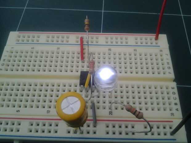 Un circuito muy simple que se puede construir a blink o flash LED. El circuito está construido con transistores, resistencias, capacitores y LEDs. Por supuesto se necesita un protoboard, puentes de alambre y una fuente de energía. La lista de piezas